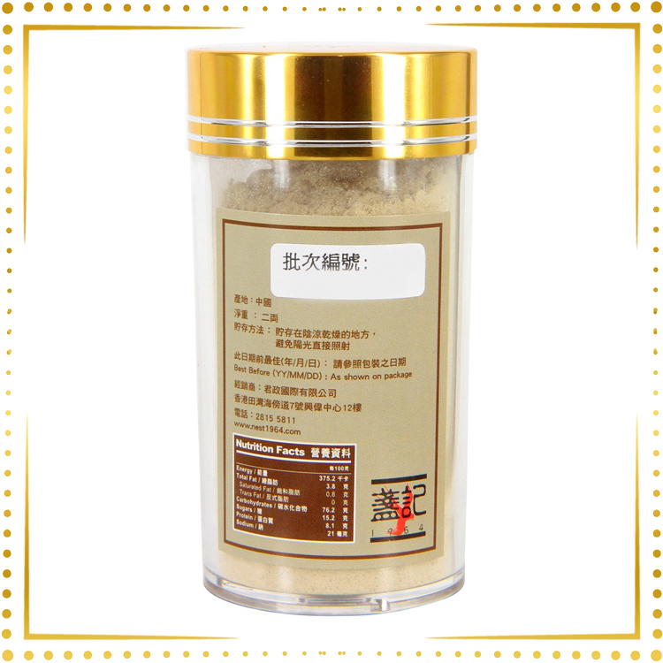 特色:田七粉,亦稱三七粉,是一種珍貴的中藥材,被譽為「活血良藥」。田七經清洗、乾燥後研磨成的灰黃色粉末,質地細膩,味微苦後回甘,可以直接沖服,更方便,粉狀更容易吸收,保存時田七需要防潮防蟲,粉狀還需防止結塊。